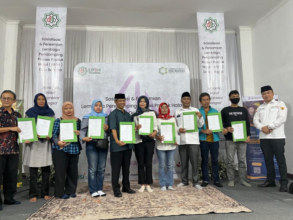 Sukabumi, Januari 2025 — Lembaga Wakaf Doa Bangsa kembali menunjukkan komitmennya dalam memberdayakan pelaku usaha mikro dan kecil (UMK) melalui penyaluran manfaat wakaf produktif. Dalam kegiatan bertajuk Sosialisasi & Peresmian Lembaga Pendamping Proses Produk Halal (LP3H) Doa Bangsa, sebanyak 10 pelaku UMK menerima sertifikat halal sebagai hasil fasilitasi dari program pendampingan yang digagas lembaga.